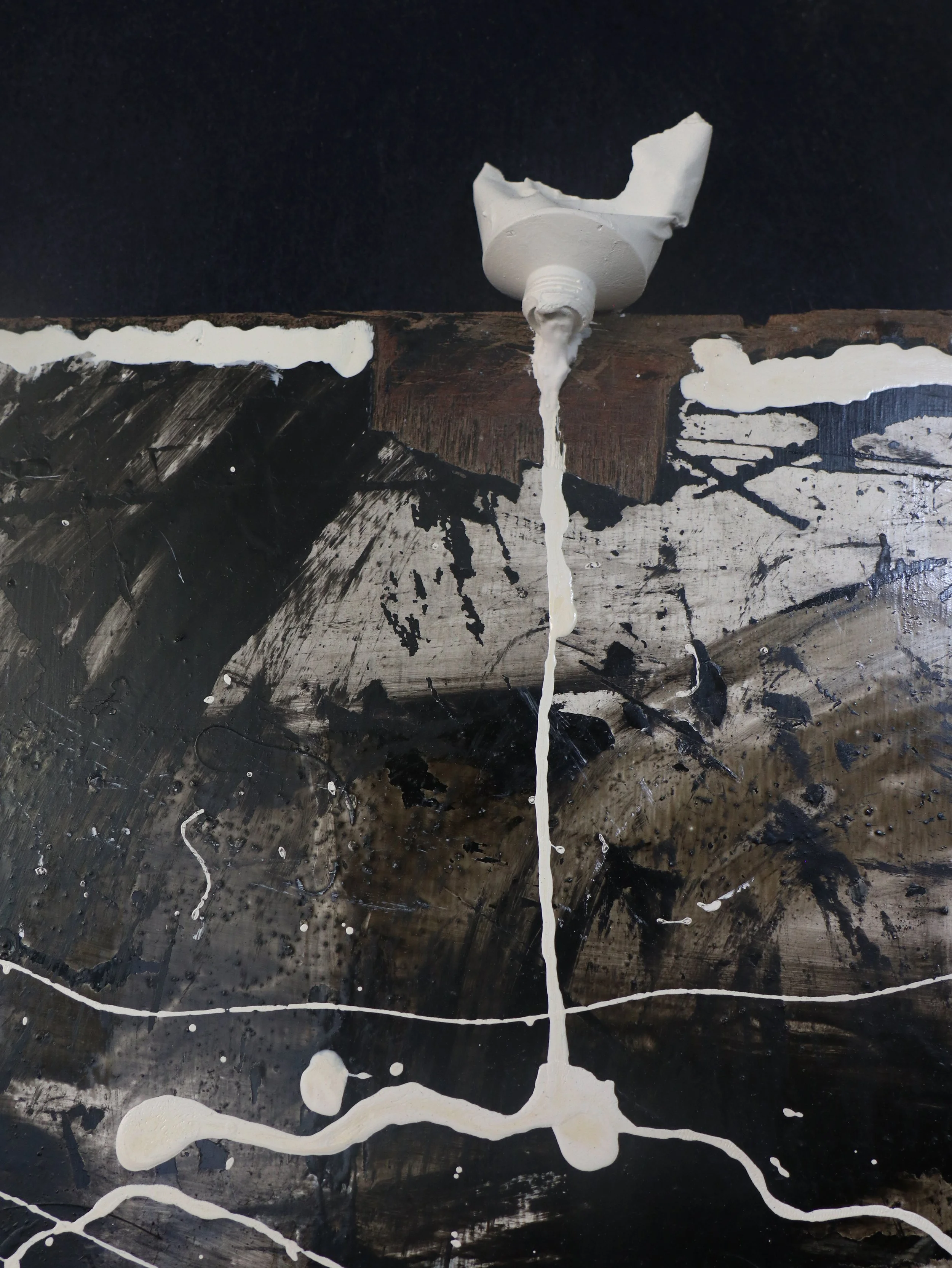charcoal, acrylic, plaster, silicone on wood