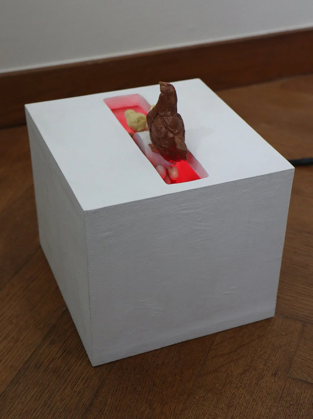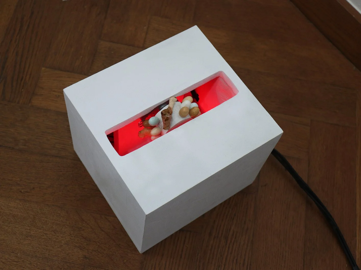 wax, plastic bag, silicone, copper wire, painted wood