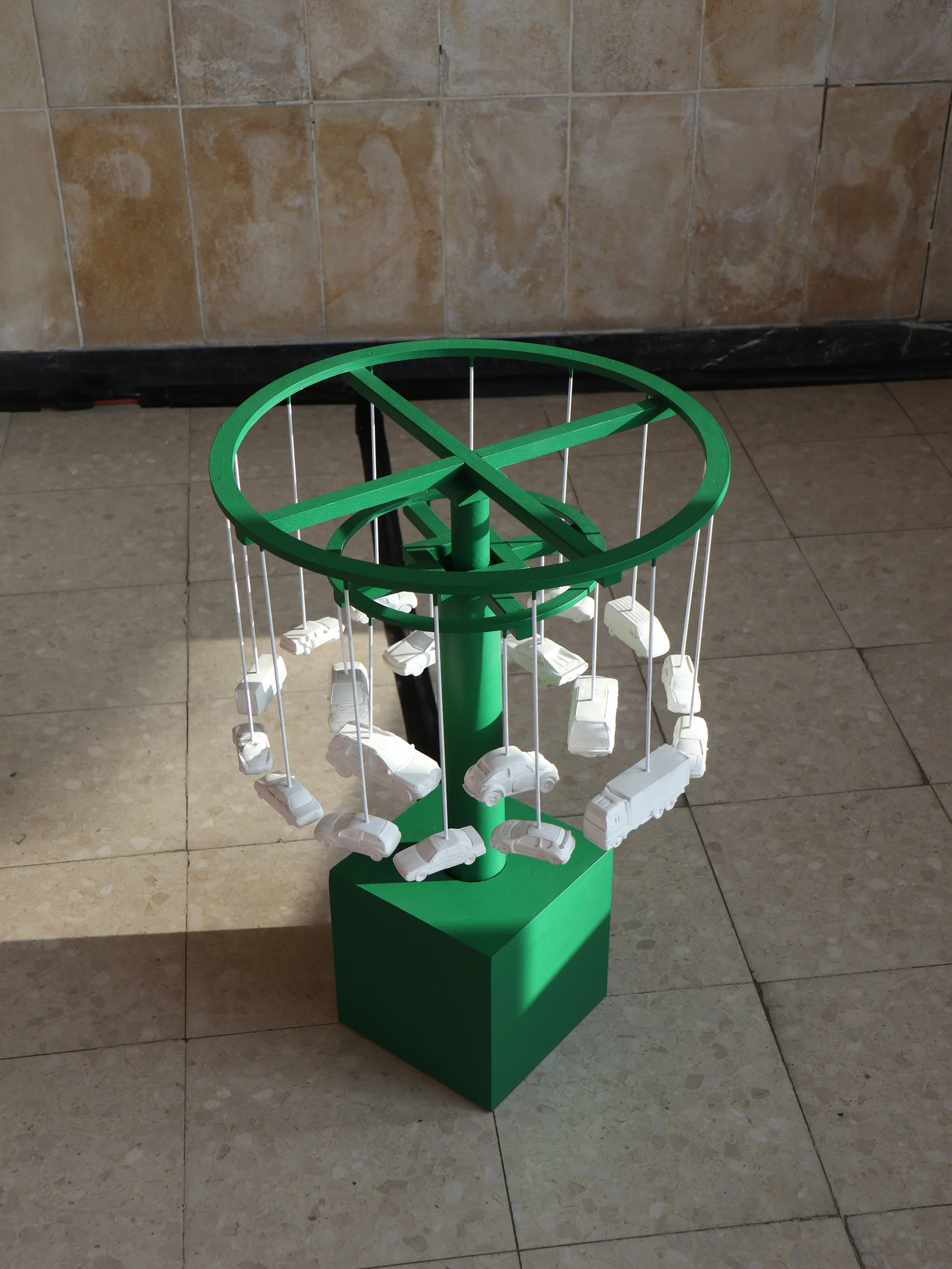 painted plastic, ceramics, wood, copper, motor, spotlight